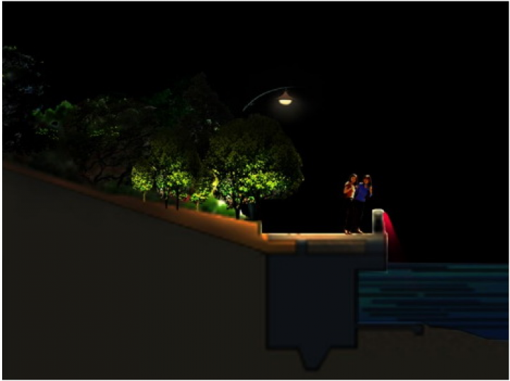 在橘子洲頭毛主席像周邊的水面上利用投影燈,將毛主席詩詞,投放在水面,打造一種唯美的意境。既可以成為一種靚麗的景觀,又符合廣場的主題。在其他節(jié)假日也可以通過修改投影的內(nèi)容,投放其他的元素,對橘子洲頭的景觀照明做出一個大的提升。在焰火廣場的的位置安裝“水幕電影”,通過以水幕為畫布,以燈光為畫筆的形式在水幕上訴說著長沙的歷史文化,水幕成為人們了解人文歷史的藝術(shù)媒介,同時又可通過安裝激光、探照燈再結(jié)合音響,利用聲光電的配合上演水幕激光秀,從而達(dá)到有景可賞的目的。傅家洲目前還沒有任何照明,我們建議傅家洲的照明須與橘子洲的光色亮度統(tǒng)一起來,如此方能形成一個整體。照明手法表現(xiàn)也是將環(huán)洲的臨江界面綠化打亮,來表現(xiàn)傅家洲的夜景輪廓以及東西兩岸看過來的夜景視覺效果。
